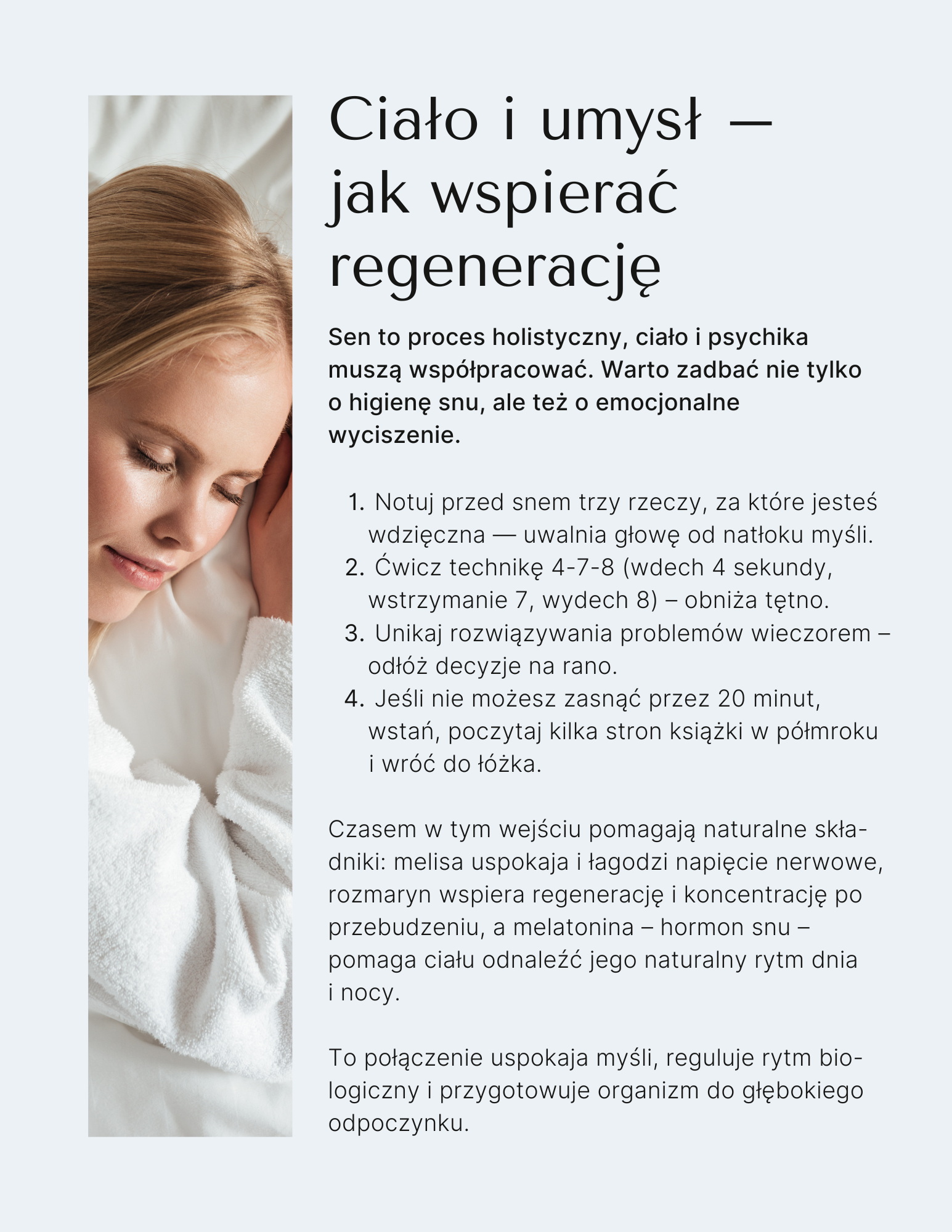 „Sen to proces holistyczny. Nie wystarczy 'przespać' 8 godzin. Kluczem do prawdziwej regeneracji jest świadome wspieranie ciała i umysłu, od wyciszenia emocji po stabilizację rytmu dobowego. To jedyna droga do jasności umysłu i stałej energii.”